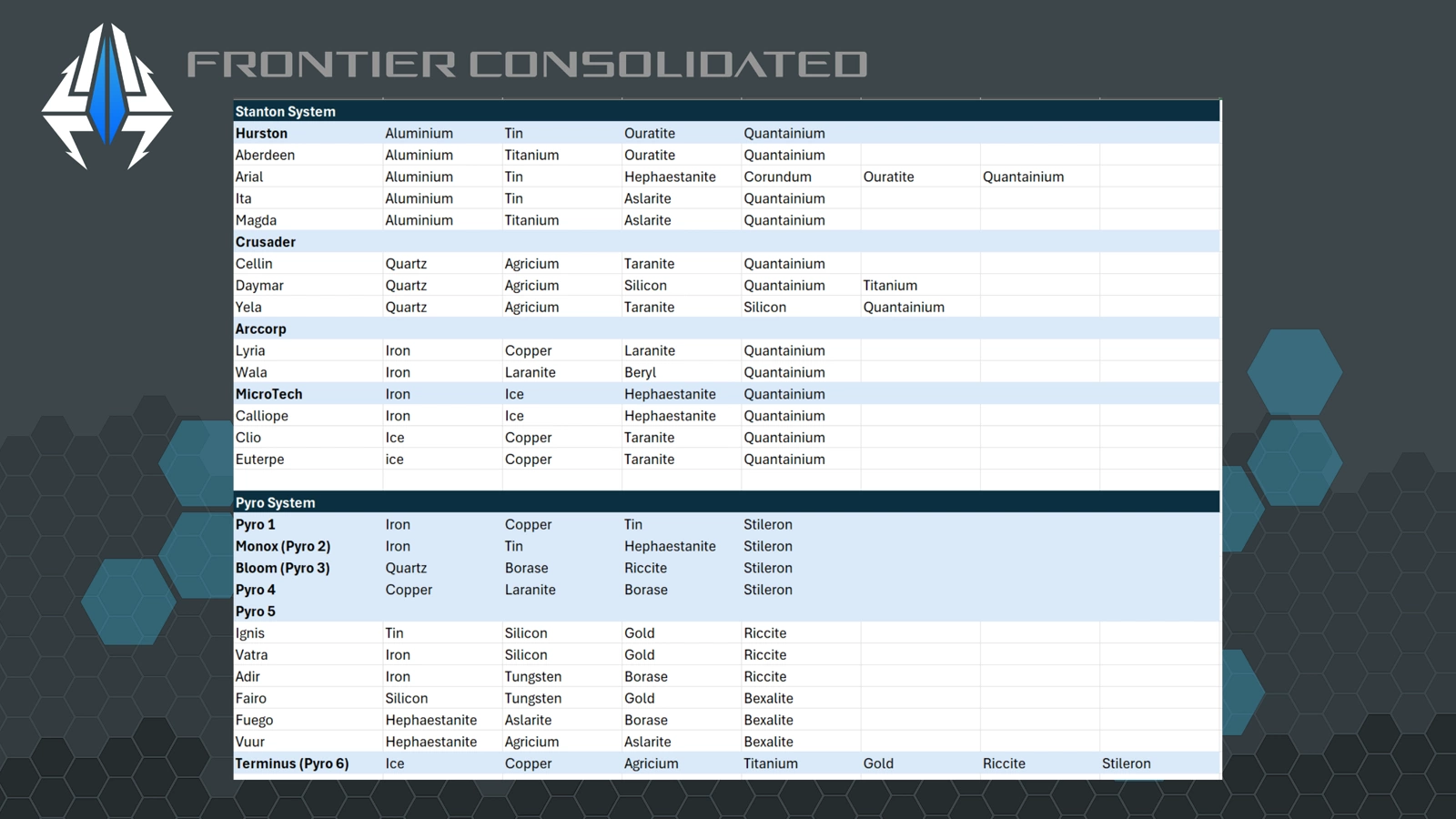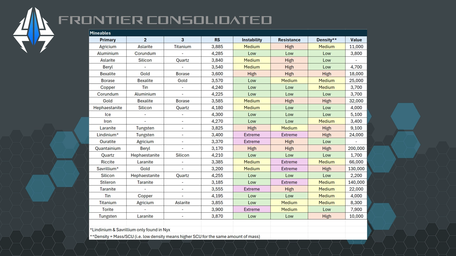 Cheat sheet showing rock types, their secondary & tertiary materials, resistance / instability / density characteristics and rough values.