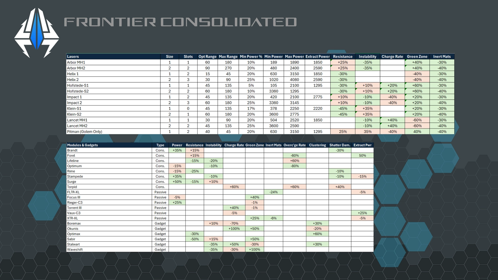 Cheat sheet covering Lasers, Modules & Gadget stats